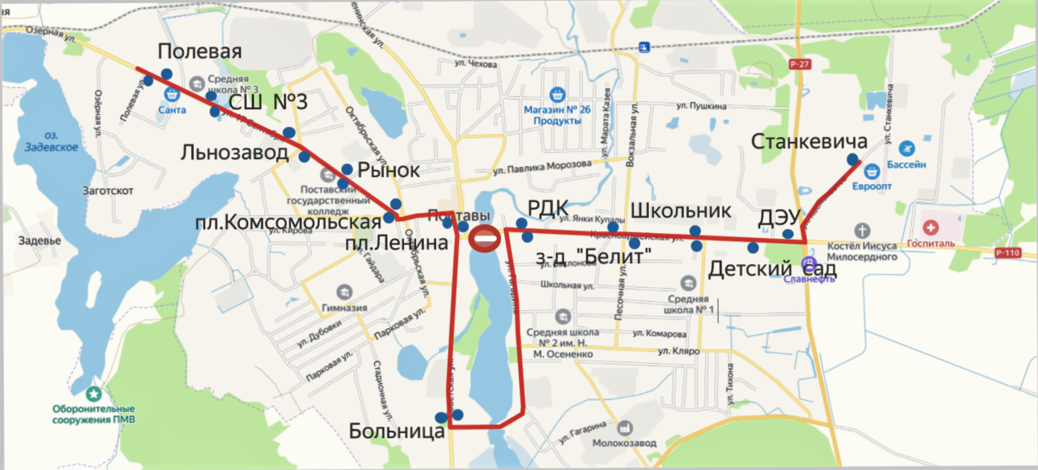 Государственное предприятие "Оператор перевозок" информирует, что с 30.10.2025 г., в связи с капитальным ремонтом, будет закрыто движение через мост на реке Мяделка по ул. Красноармейской в г. Поставы, объезд по маршрутам №1 и №1Т будет осуществляться по следующей схеме движения.